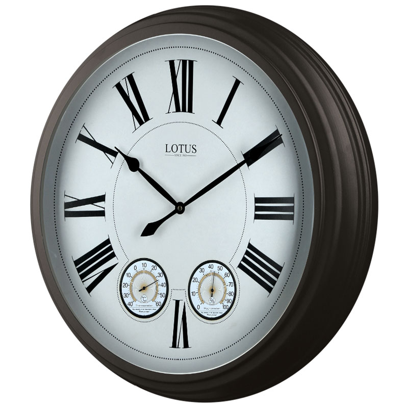 ساعت دیواری فریم فلزی لوتوس مدل BAKERSFIELD دارای دماسنج و رطوبت سنج است.