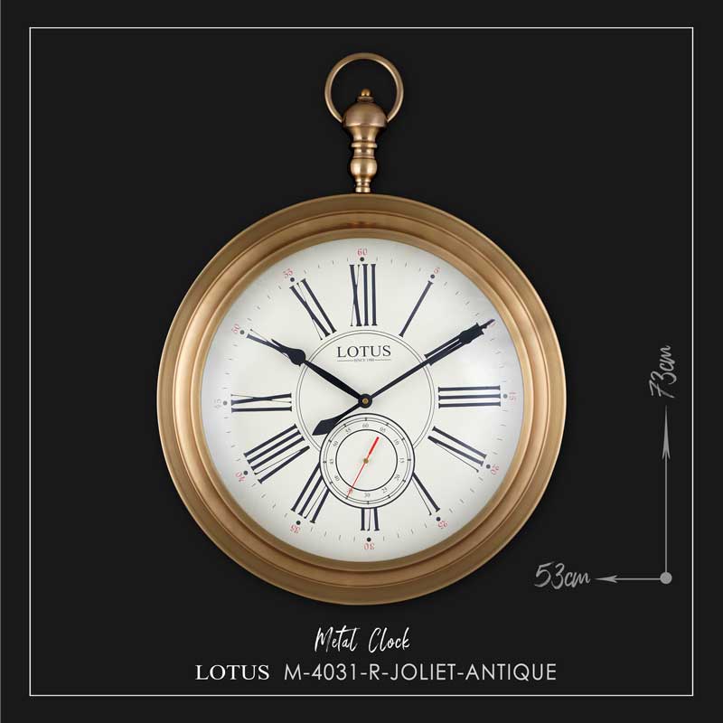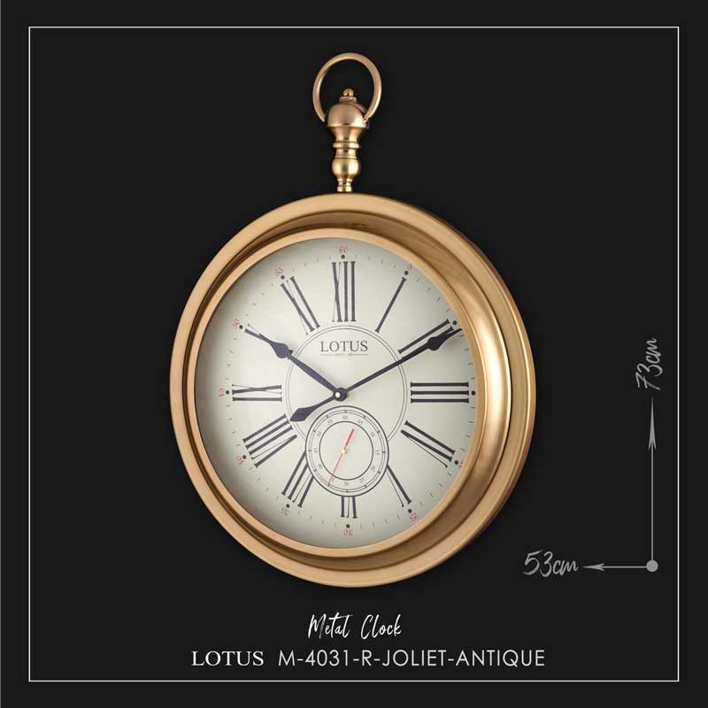 ساعت دیواری فلزی مدل JOLIET رنگ آنتیک با اعداد یونانی، یکی از زیباترین ساعت های دیواری لوتوس است که به سبک ساعت های جیبی نوستالژیک طراحی شده است. ساعت دیواری JOLIET در عین حال که ساختاری مدرن و جذاب دارد، برای دکور امروزی بسیار مناسب است. وجود موتور ثانیه شمار در صفحه از مزیت های این مدل است.