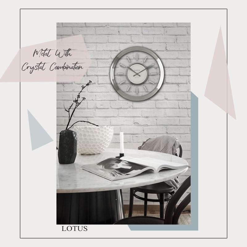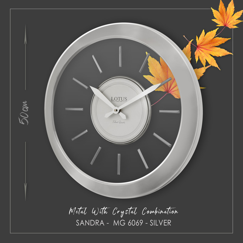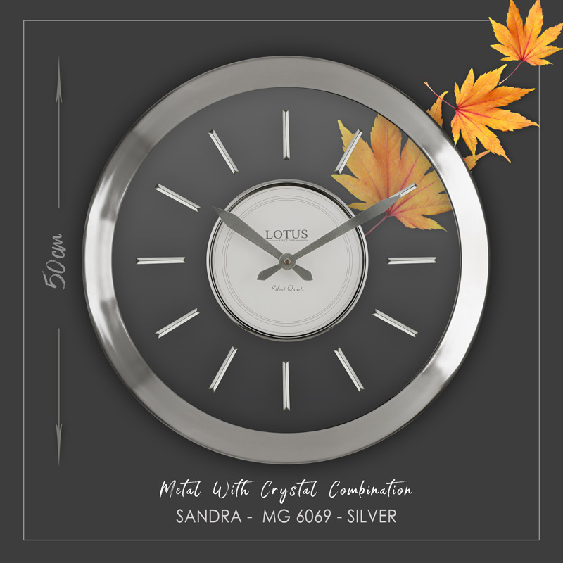 ساعت دیواری فلزی SANDRA با صفحه زیبای کریستالی از جدید ترین محصولات گروه تولیدی لوتوس است. ترکیب زیبای کریستال با فلز آبکاری سیلور شاهکاری بی نظیر خلق کرده که دکور فضا را کاملا متحول می کند.