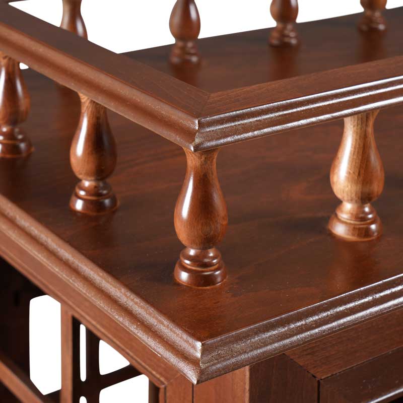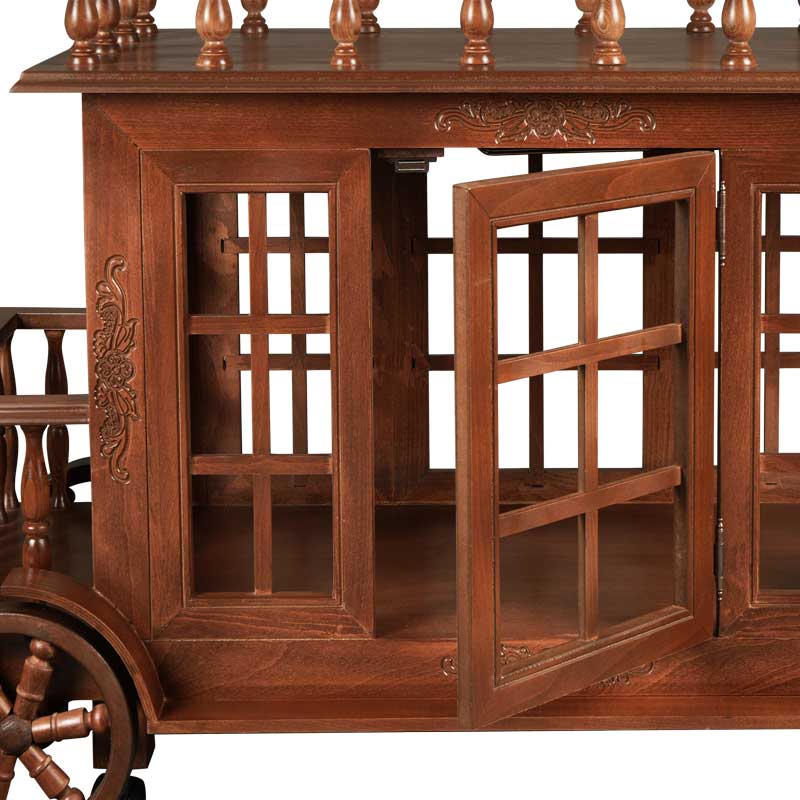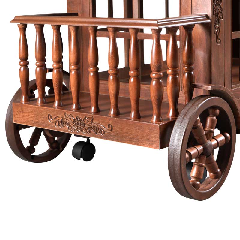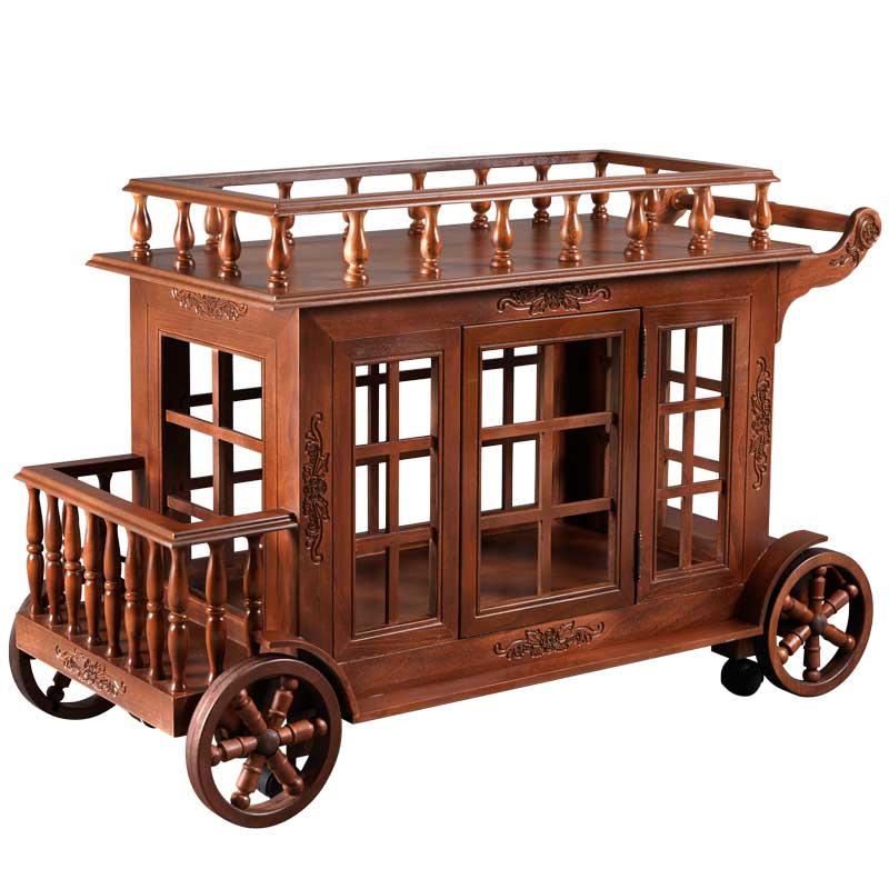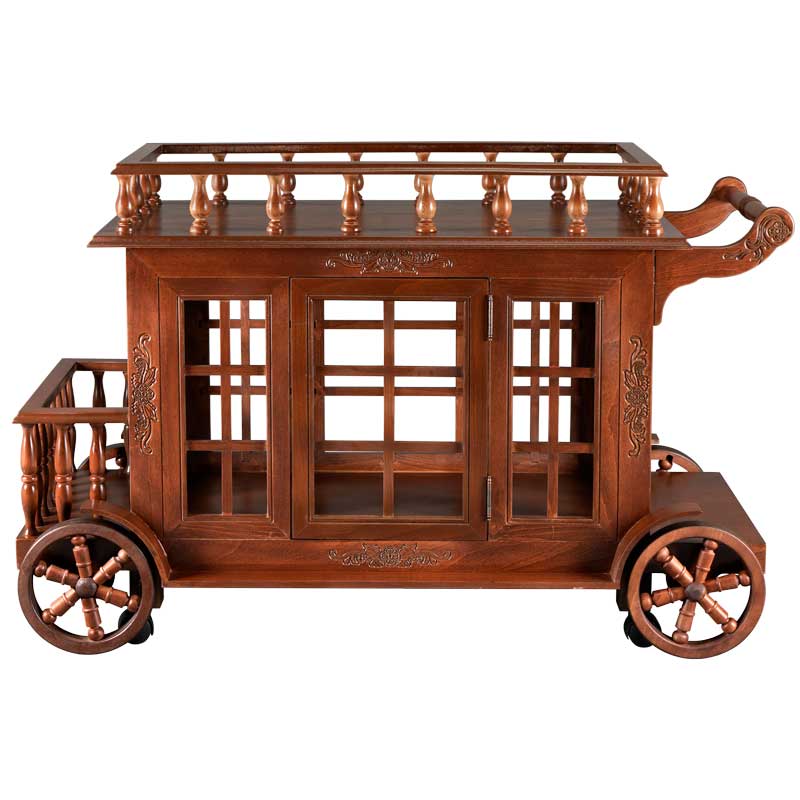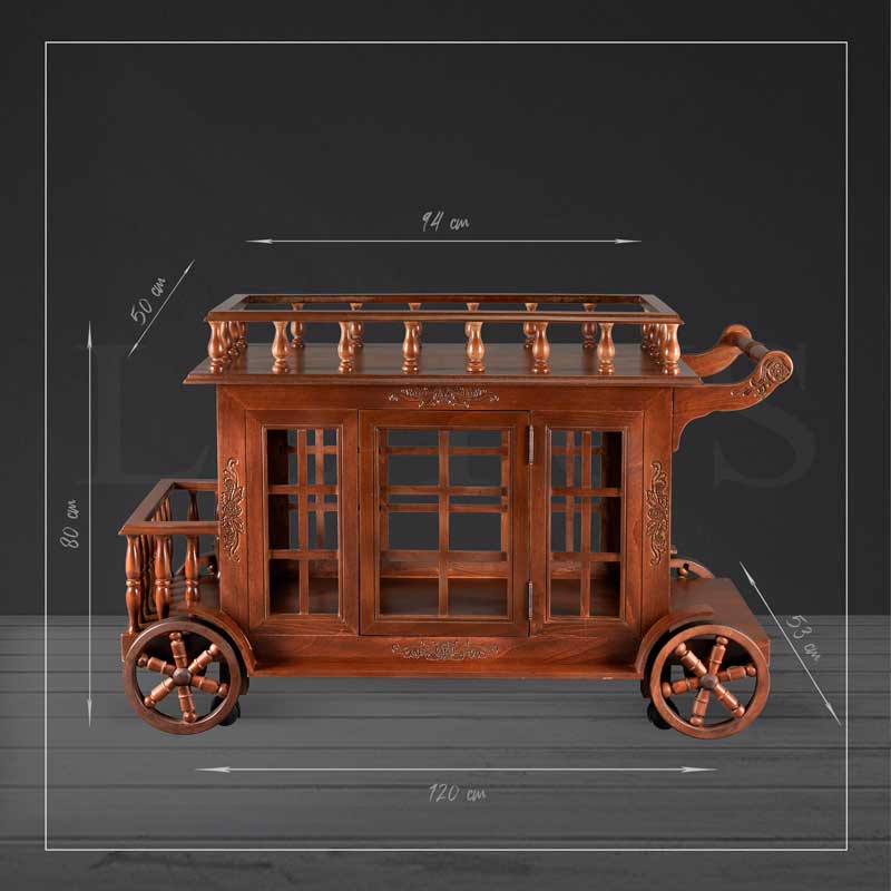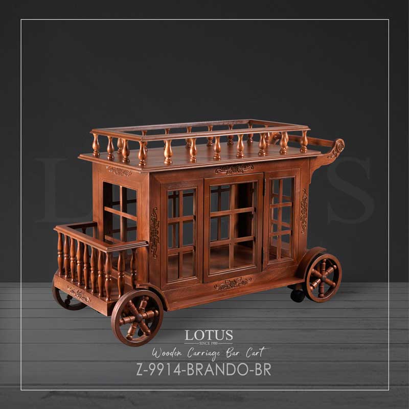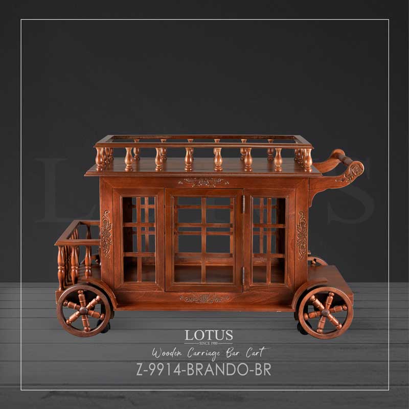 تمایز و برتری این مدل نسبت به بارکارت های دیگر لوتوس، استفاده از تعداد بالای قطعات خراطی چوبی در ساخت سازه این مدل است که شاهکاری در طراحی و اجرای میز بار کالسکه چوبی مدل BRANDO محسوب می شود. در این مدل بالای صد قطعه خراطی چوبی استفاده کرده ایم که جلوه بصری مدل را بیشتر کرده است. اگر فقط به قسمت های پنجره ای مدل دقت نمایید، بالای شصت قطعه چوبی به هم متصل شده را میبینید. شاید فکر کنید که با قطعات کمتر هم میتوانستیم این پنجره های چوبی را بسازیم اما واقعیت این است که قطعا محصول به جذابیت و ابهت فعلی نمی رسید.